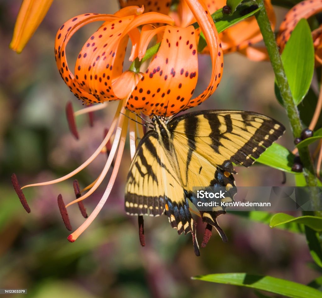 A Tiger Swallowtail butterfly feeds on an orange Turks Cap Lily (Lilium superbum) in a Cape Cod garden.